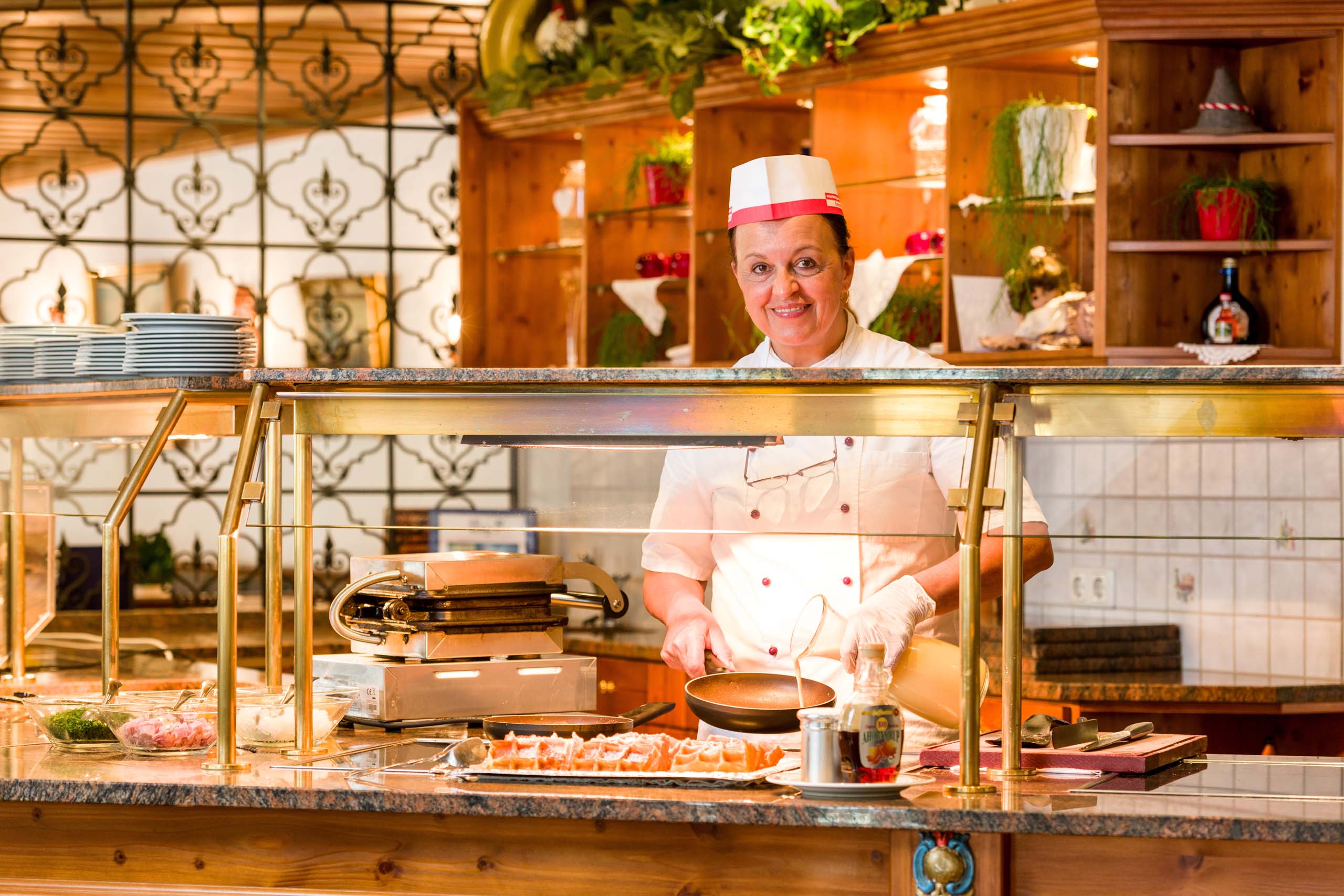 Als gast met halfpension wacht je tussen 18:00 en 20:00 uur een 4-gangenmenu naar keuze met salade en voorgerechtenbuffet, soep, hoofdgerecht, dessertbuffet en kaasplankje. Om ervoor te zorgen dat er voor elk wat wils is, creëren onze keukenchef Fidelius en zijn team elke dag heerlijke vlees-, vis- en vegetarische gerechten.